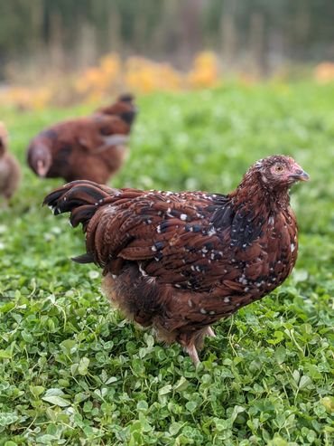 Orpington (Silver Laced) One of the most stunning breed colors there is out there. Beautiful plumage outlined in a rich dark Black, Chocolate or Gold. Orpington are easy keepers and fair well in the winter. Their full fluffy feathering makes them not as resistant to heat and therefor need shade areas to cool down in the summer. The hens are decent layers of med brown eggs. The Roosters are absolute show stoppers with their large size and colorful feathering. If you are looking for beauty and grace in your flock SLO are a must have.